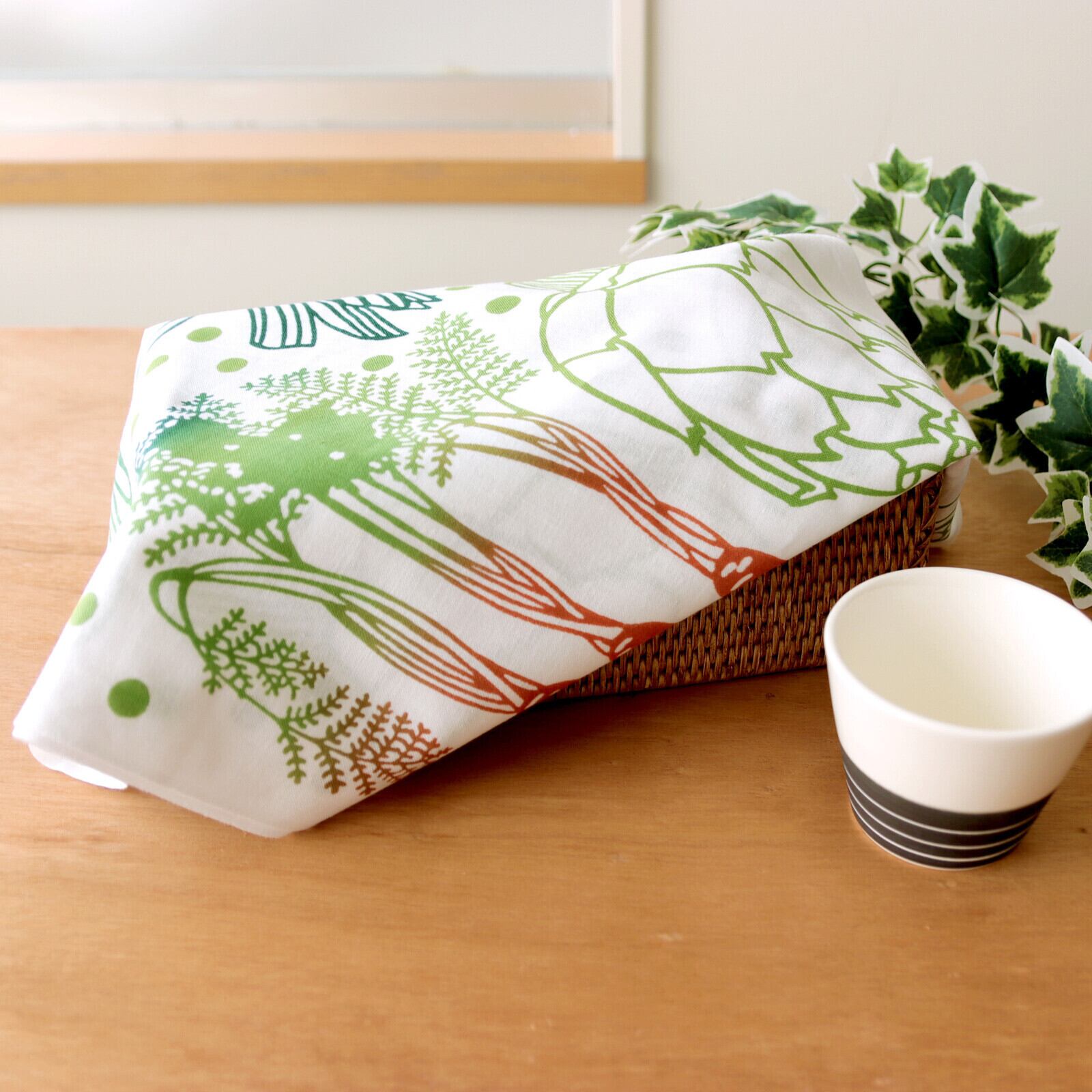 にんじん、ミニトマト、アーティチョークなど、いろいろな野菜を大きくあしらった柄で、