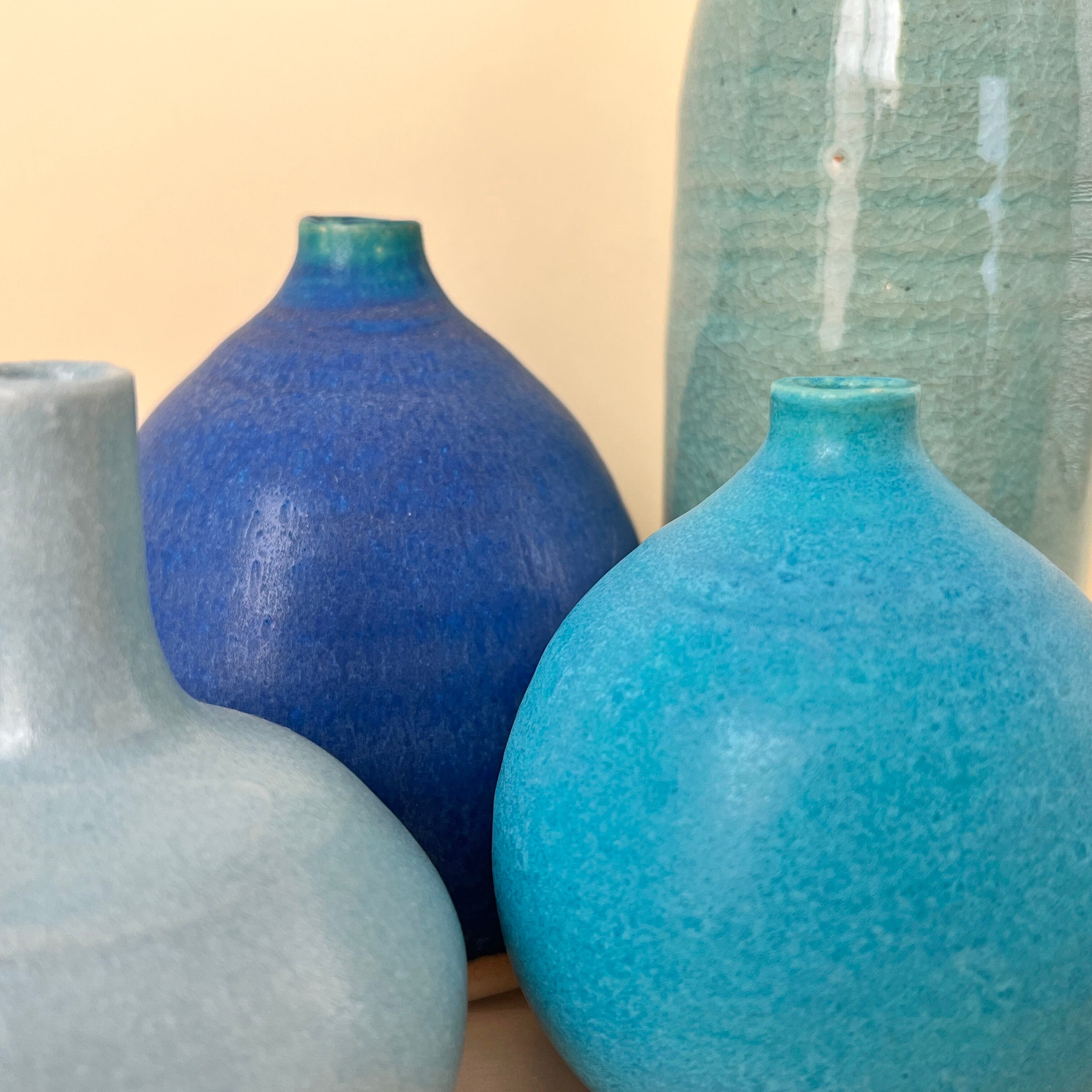 野の花を一輪、無造作に挿しても絵になりますし、同じシリーズの青いフラワーベースをいくつか並べただけでも素敵なインテリアになります。